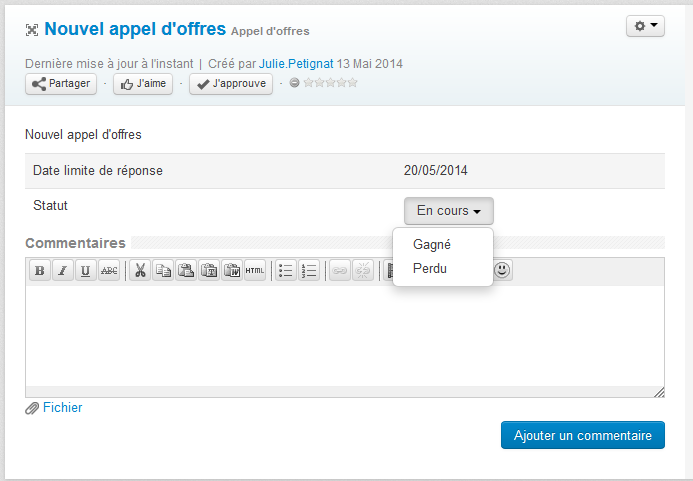 Avec le nouvel objet de publication « Appel d’offres » collaborez autour de vos réponses aux appels d’offres et centralisez les informations au sein de votre plateforme Jamespot. Echangez autour des documents à fournir de manière transversale entre les services, partagez la date limite de réponse et les résultats via un workflow dédié.