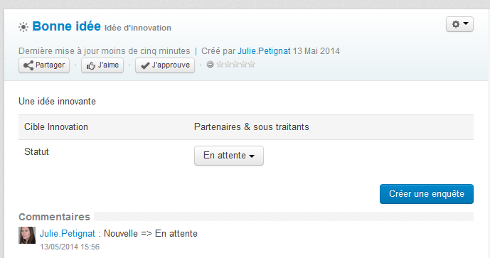 Grâce à l’application Idée d’innovation, chaque utilisateur peut proposer ses idées aux membres d’un ou plusieurs groupes en précisant la cible de l’idée (Interne, partenaires et sous-traitants, clients, prospects, autres). Le workflow est éditable par l’administrateur de plateforme via le gestionnaire d’applications, ce qui qui signifie que vous pouvez paramétrer des états qui correspondent à votre organisation et vos processus. Par ailleurs, certains états pré-paramétrés font apparaître des suggestions d’actions via des boutons spécifiques. Ainsi l’état « en attente » suggère la création d’une enquête, tandis que l’état « projet » la création d’un plan d’actions.