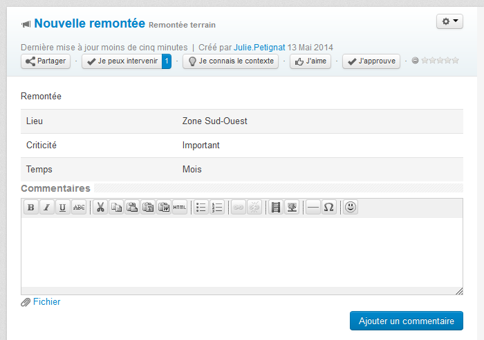 Accédez rapidement aux retours d’expérience des membres de l’organisation qui sont sur des sites distants ou en déplacement grâce à l’application « Remontée terrain ». Les utilisateurs peuvent renseigner des champs pré-paramétrés, tandis que chacun peut réagir selon sa propre expérience via les actions sociales adaptées.
