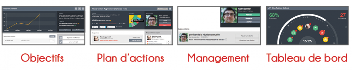 Cet outil se présente sous la forme d’une suite d’applications intégrées à la plateforme Jamespot : objectifs, plan d’actions, management, tableau de bord.